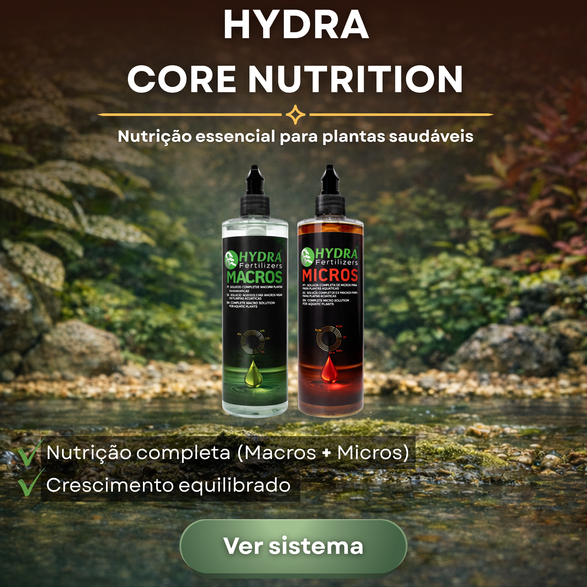 Na Hydra criamos sistemas completos para aquários de água doce — desde nutrição das plantas até estabilidade biológica e água cristalina.